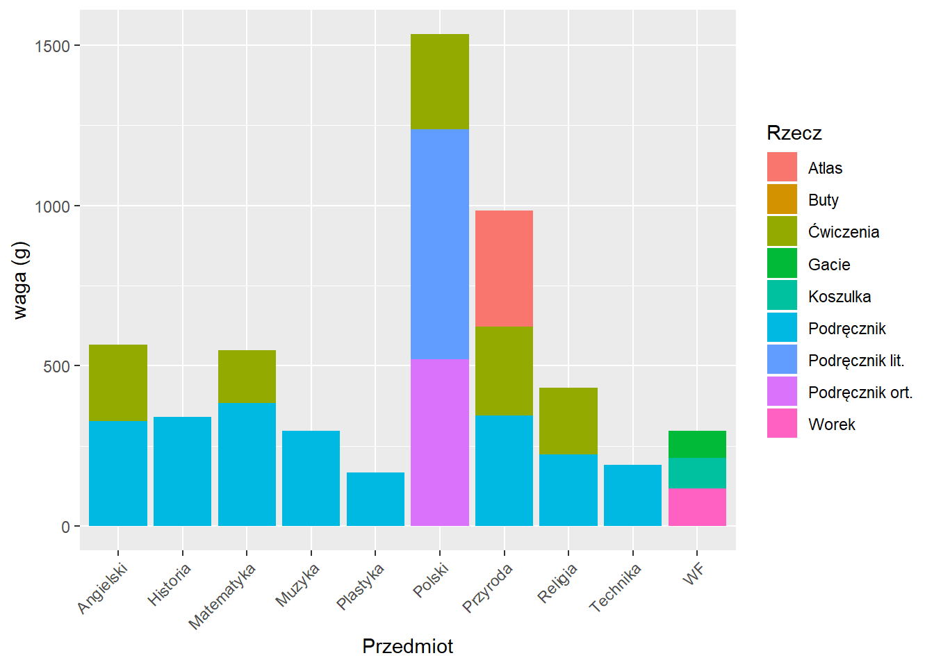 ggplot(aes(x = Przedmiot, weight = Waga, fill = Rzecz)) +